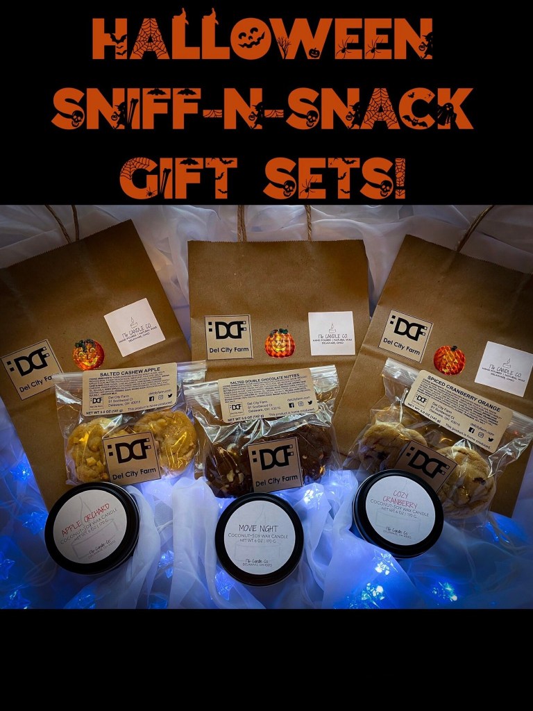 Introducing the “Halloween Sniff-n-Snack” gift set! 🎃 Each gift set comes with one dozen of my homemade cookies paired with one of the last , awesome, hand poured, vegan, coconut-soy wax, 6 oz., 176 Candle Co – Family & Friends candles available in a complimentary scent. ❤️🔥🍪🕯 The sets are perfect for gifting 🎁, as they’re all packed into a 100% recycled content ♻️, kraft paper bag with a sparkly Jack-o’-lantern sticker ✨🎃 nestled between our logos. 🤡