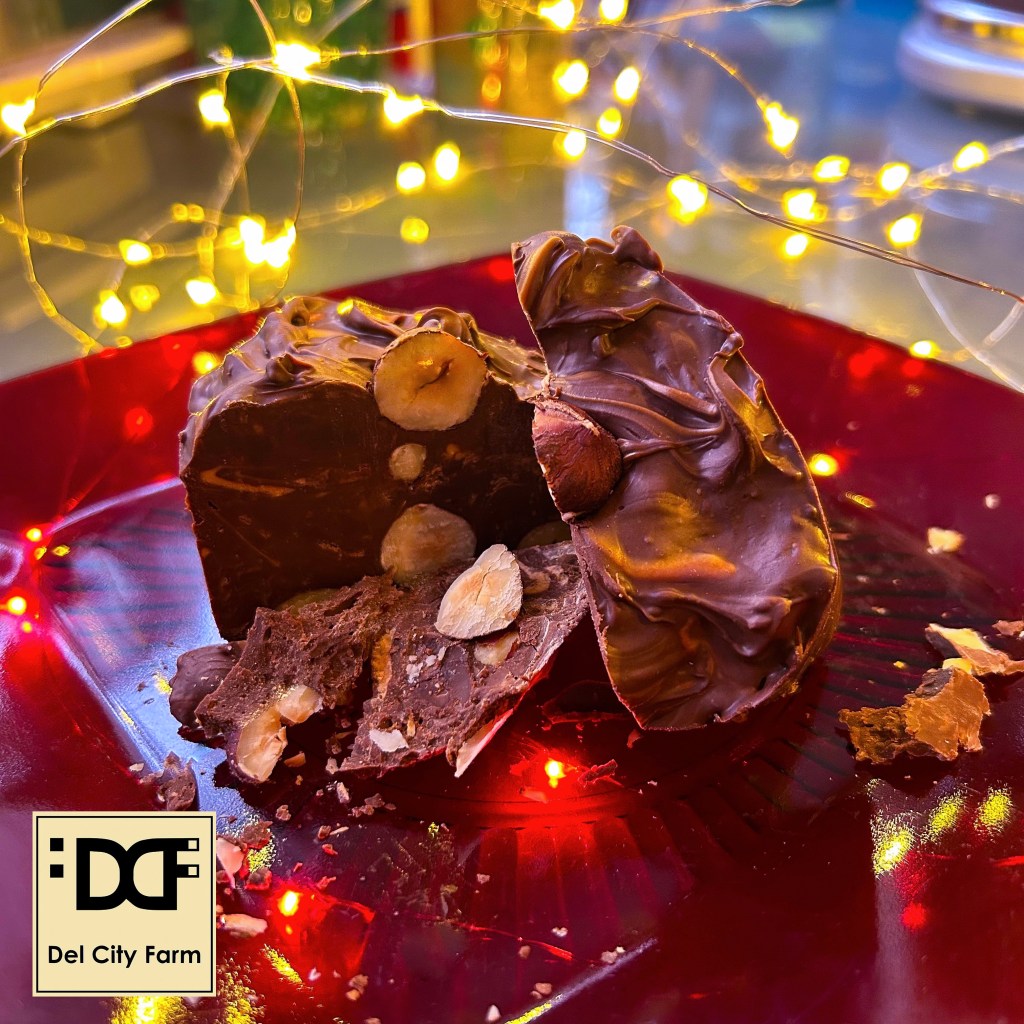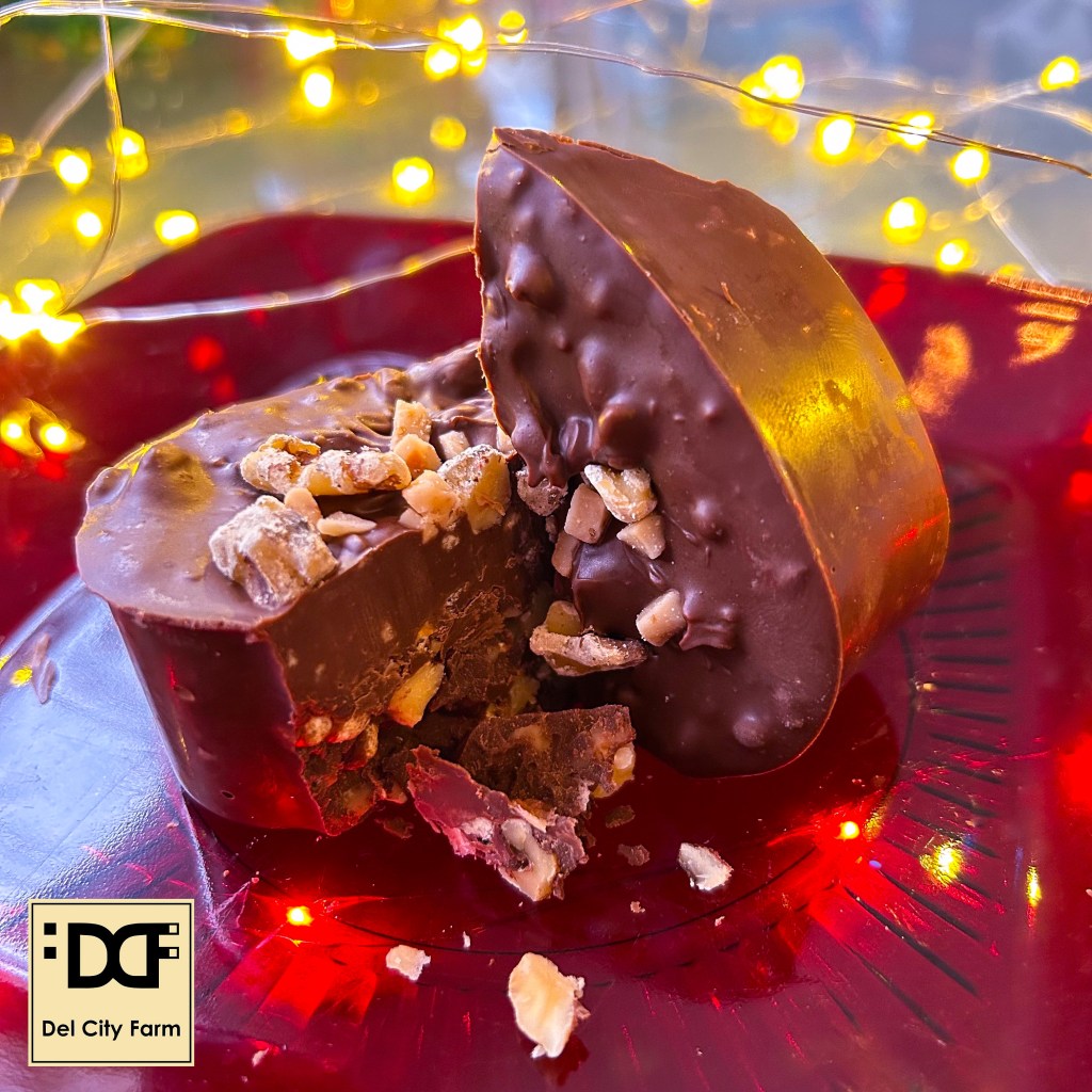 Darker Chocolate Hazelnut Caramel – a creamy, darker chocolate and caramel swirled candy filled with whole, raw hazelnuts
