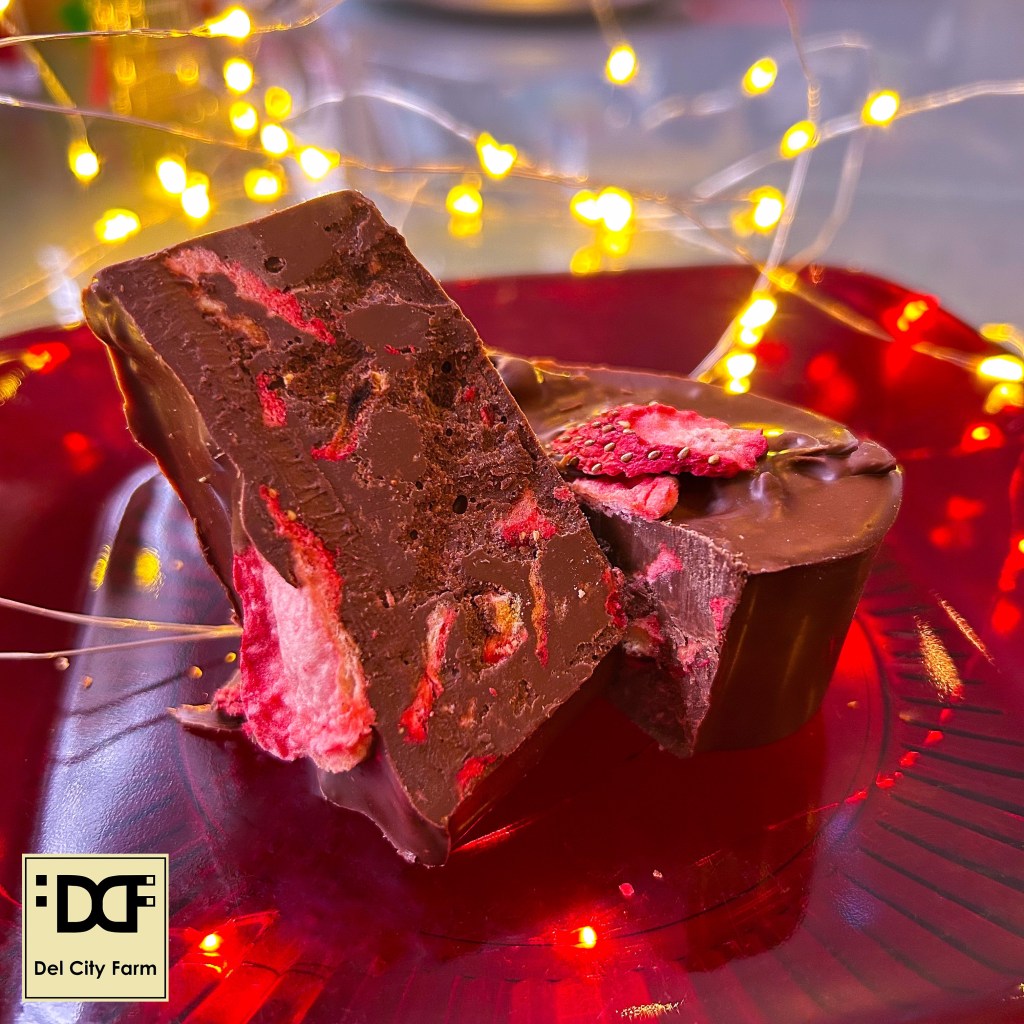 Chocolate Strawberry – a creamy chocolate candy filled with crisp, tart, freeze dried strawberries