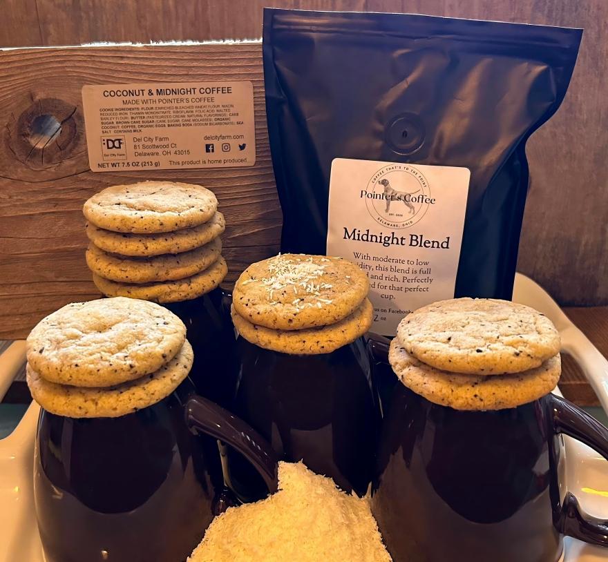 Coconut & Midnight Coffee – with unsweetened, organic, shredded coconut and freshly ground, locally roasted Pointer’s Coffee Midnight Blend mixed straight into a super buttery, chewy, slightly crunchy cookie base, the slight crunch of the delicate grounds fills your mouth with this espresso roast’s darkly robust flavor and the light, nutty, chewiness of the shredded coconut. Perfect for those who love a strong cuppa.
