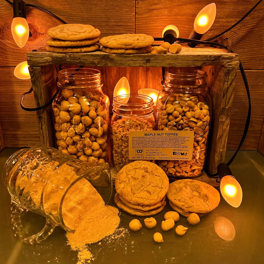 Maple-Nut Toffee – harkening back to the old fashioned, tasty confections, Brach’s Maple Nut Goodies, this cookie is made of delicious ingredients like unsalted butter, real maple sugar, fresh roasted peanuts, little chunks of yummy, buttery toffee, a splash of maple flavor that actually contains organic maple syrup and molasses, and a smidgen of sea salt. A chewy, snappy cookie that’s perfect for any day or occasion.